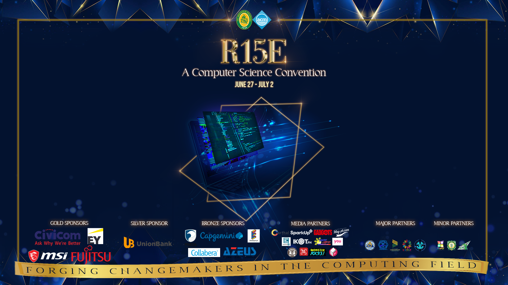 R15E would not have come to successful fruition without the help of its GOLD SPONSORS: MSI Philippines, Fujitsu Philippines Global Delivery Center (WeServ Systems International, Inc.), Ernst & Young Global Delivery Services Philippines, and Civicom Pacific. SILVER SPONSOR: Union Bank of the Philippines, and BRONZE SPONSORS: Azeus Systems Philippines Limited, Capgemini, Collabera, Pineda Cybersecurity, and Edukasyon.PH. R15E's media partners are BLB Live, Blog PH, Carthal Manila, Diyaryo Milenyo - Digital News, Explained PH, Gadgets Magazine, SparkUp, IKOT.PH, Twist TV, You.PH, Monster RX93.1, and WhenInManila.com. The enduring partnership between FEU Tech ACM and student organizations from different institutions in the Philippines also helped make the event possible.